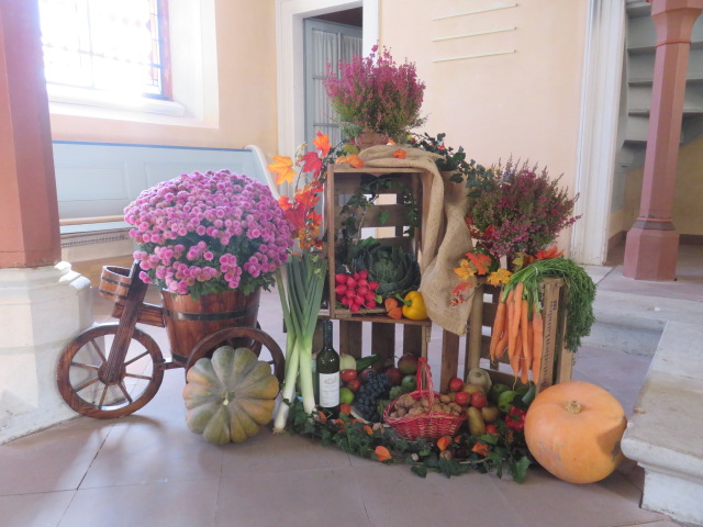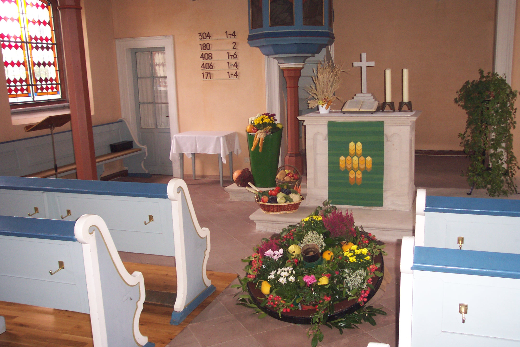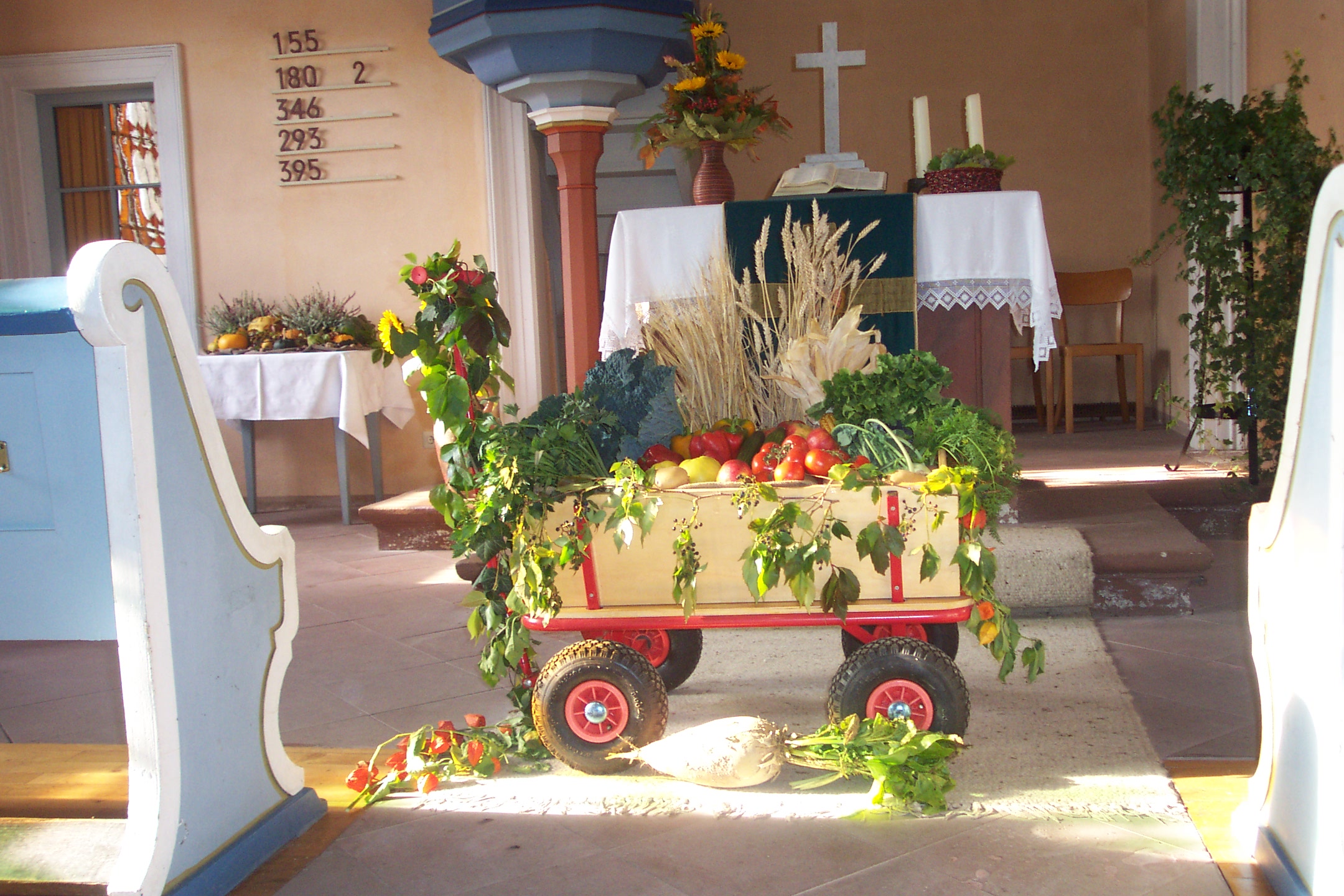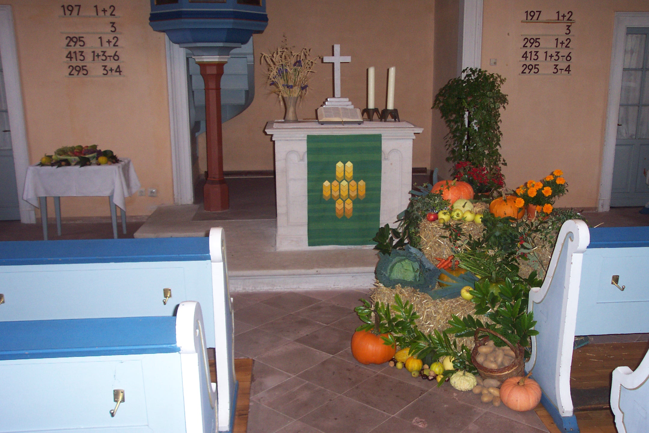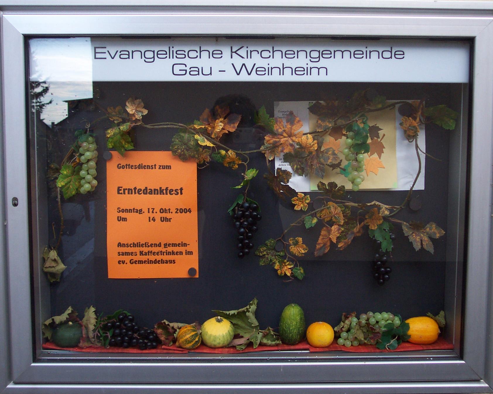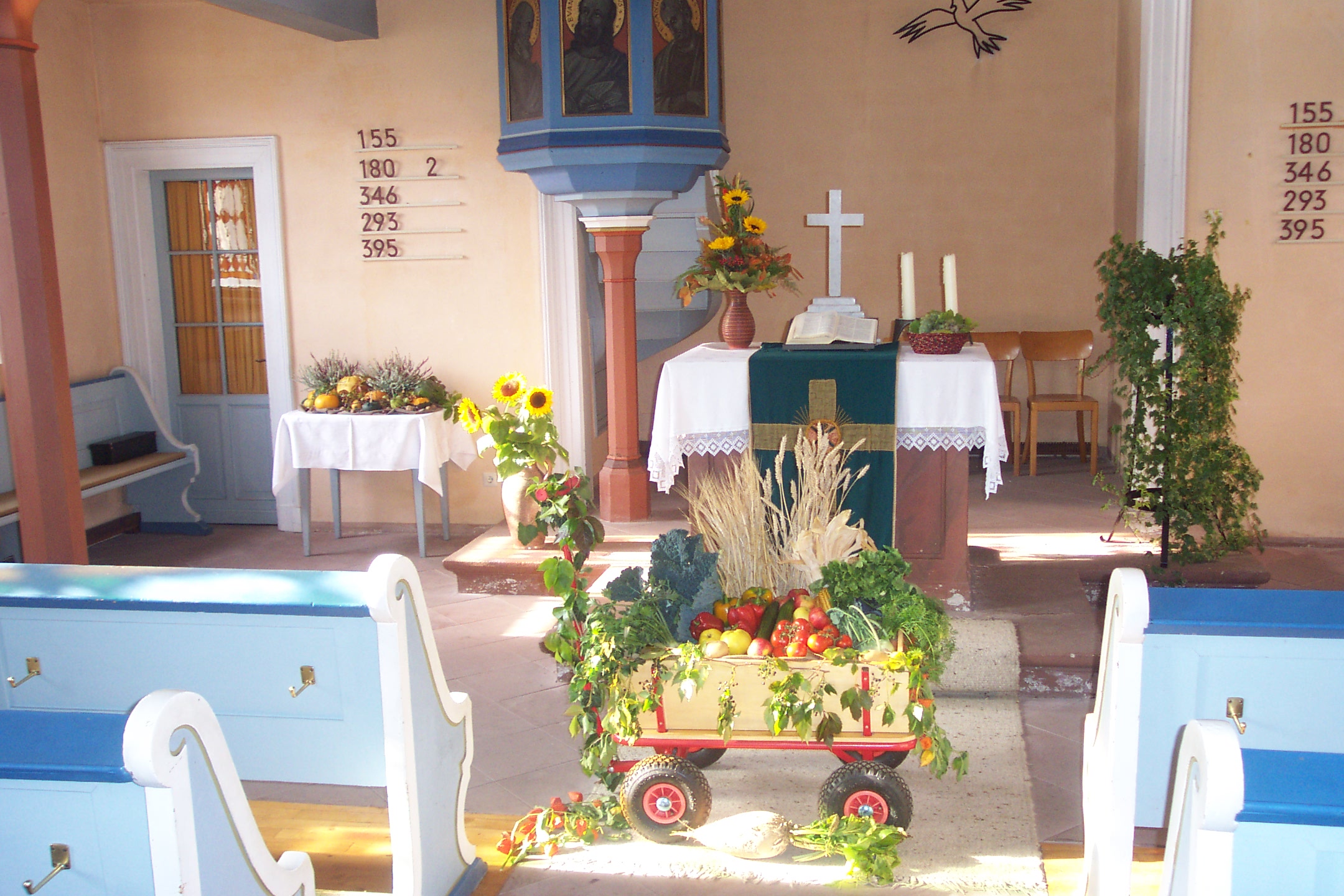 Zum Erntedankfest wird die evangelische Kirche von Gau-Weinheim mit Erntegaben, wie Blumen, Obst und Gemüse, geschmückt. Der Kirchenvorstand bemüht sich Jahr um Jahr neue Dekorationsmöglichkeiten zu finden.