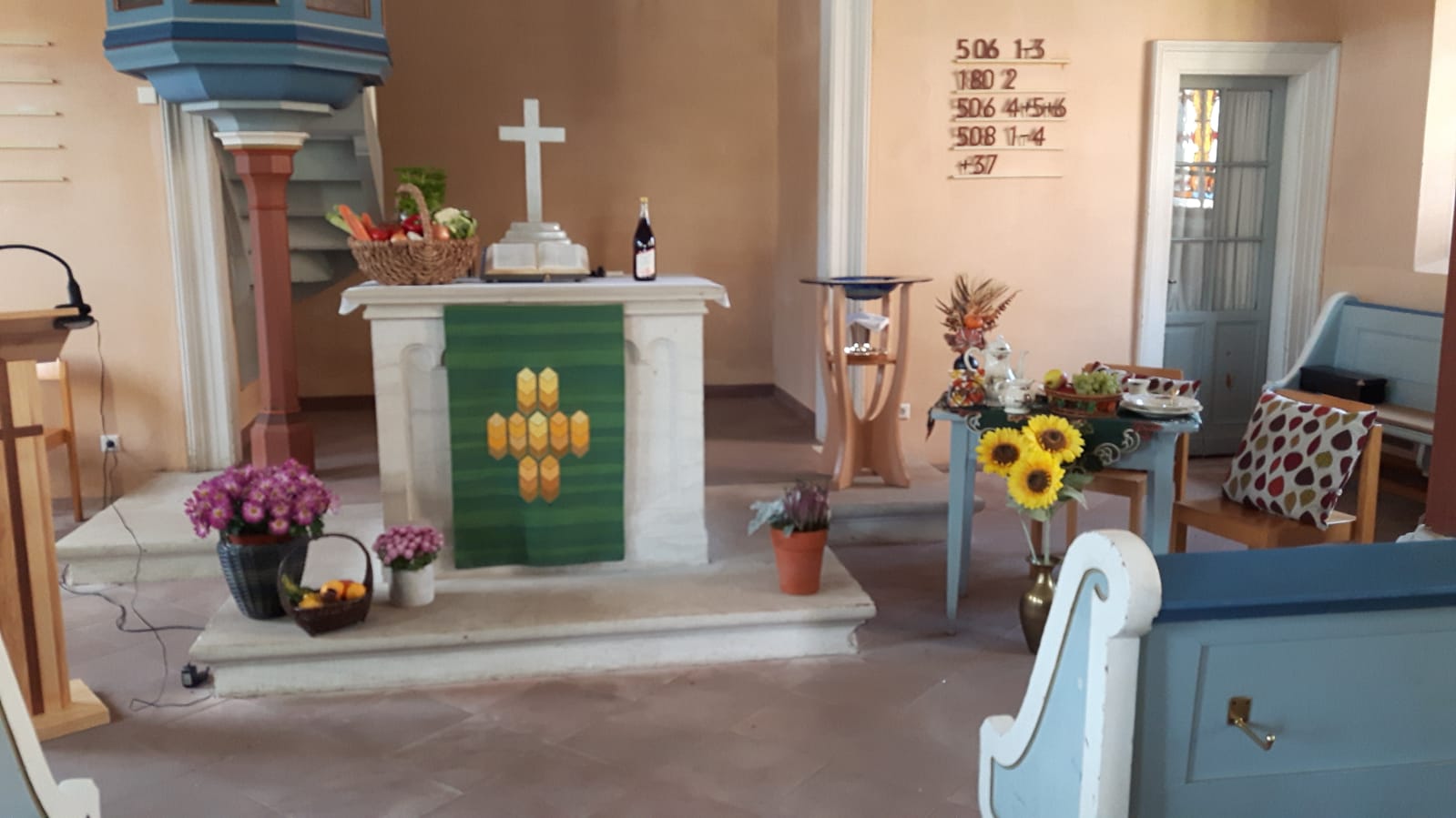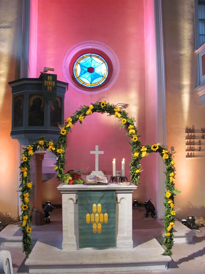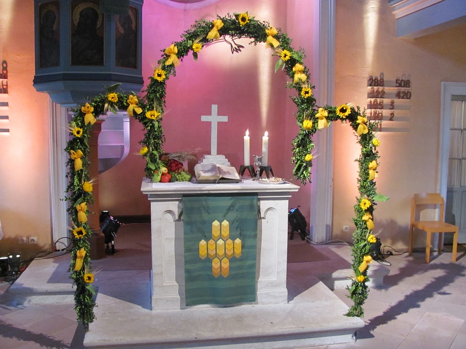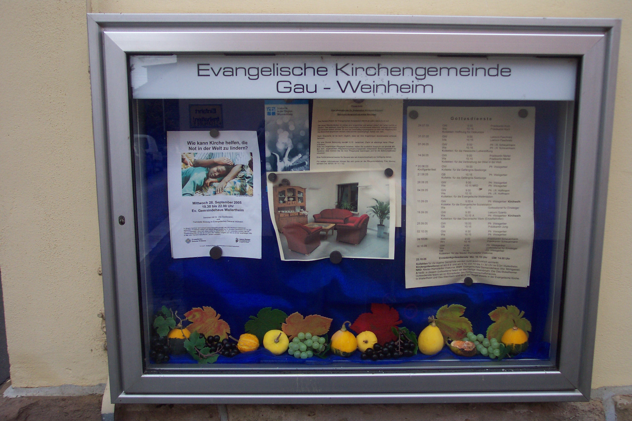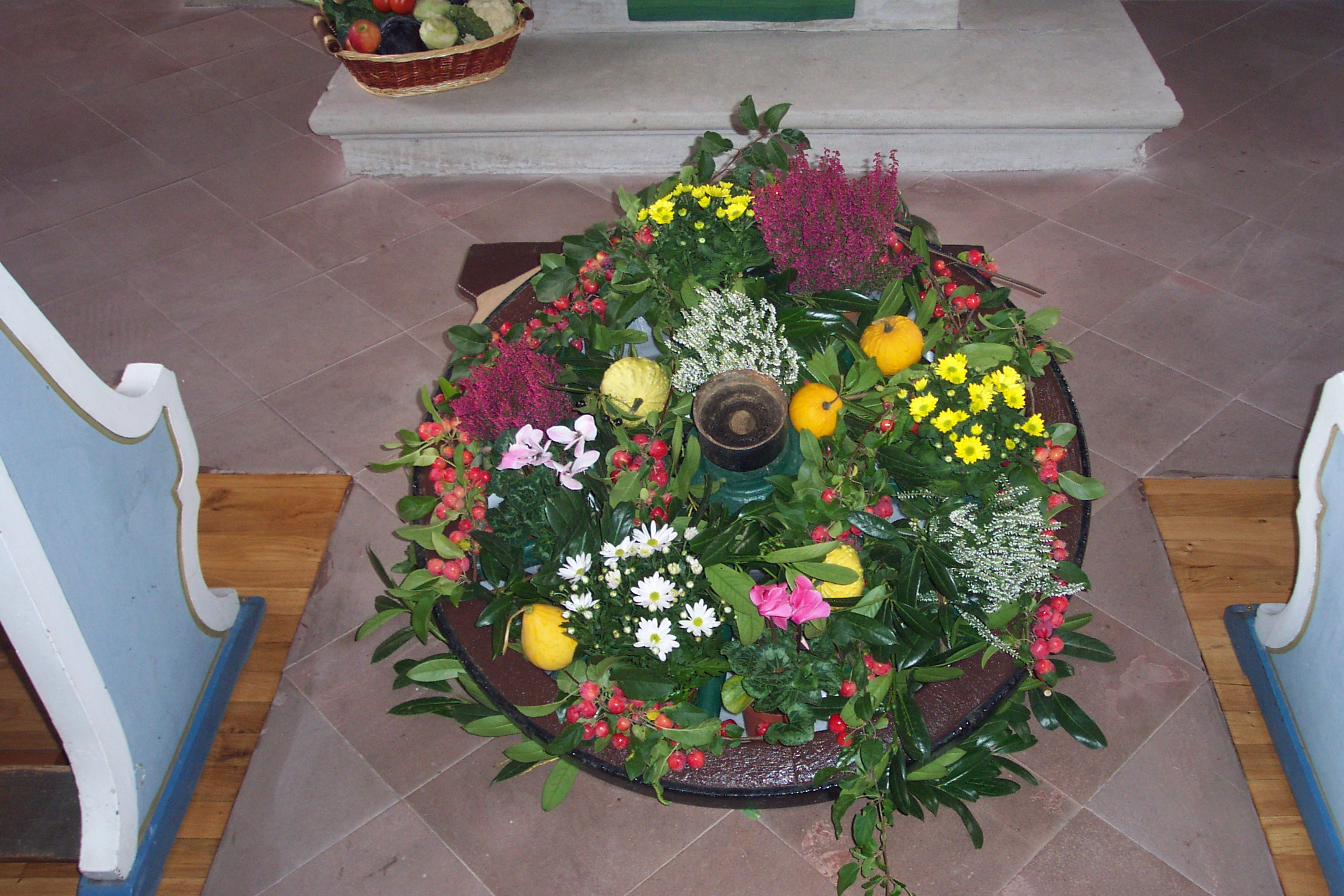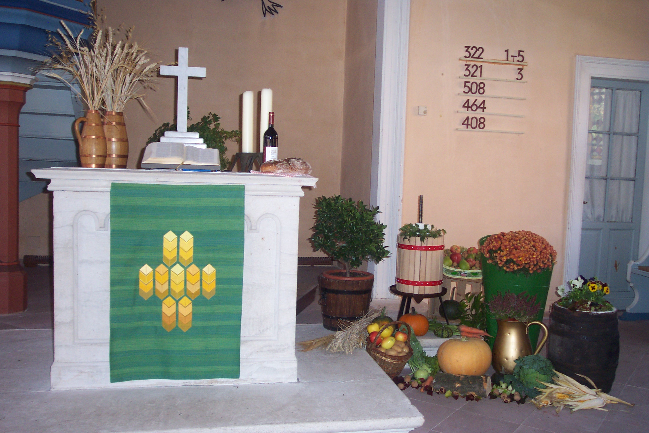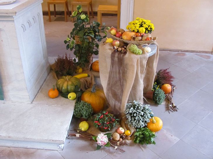 Zum Erntedankfest wird die evangelische Kirche von Gau-Weinheim mit Erntegaben, wie Blumen, Obst und Gemüse, geschmückt. Der Kirchenvorstand bemüht sich Jahr um Jahr neue Dekorationsmöglichkeiten zu finden.