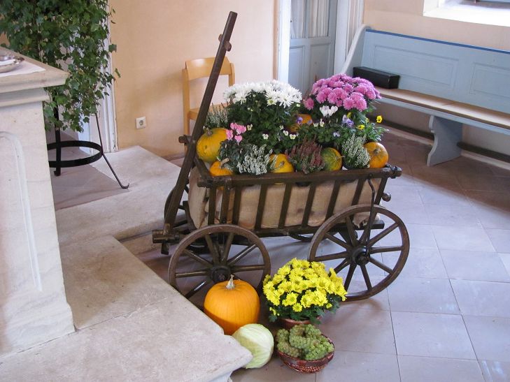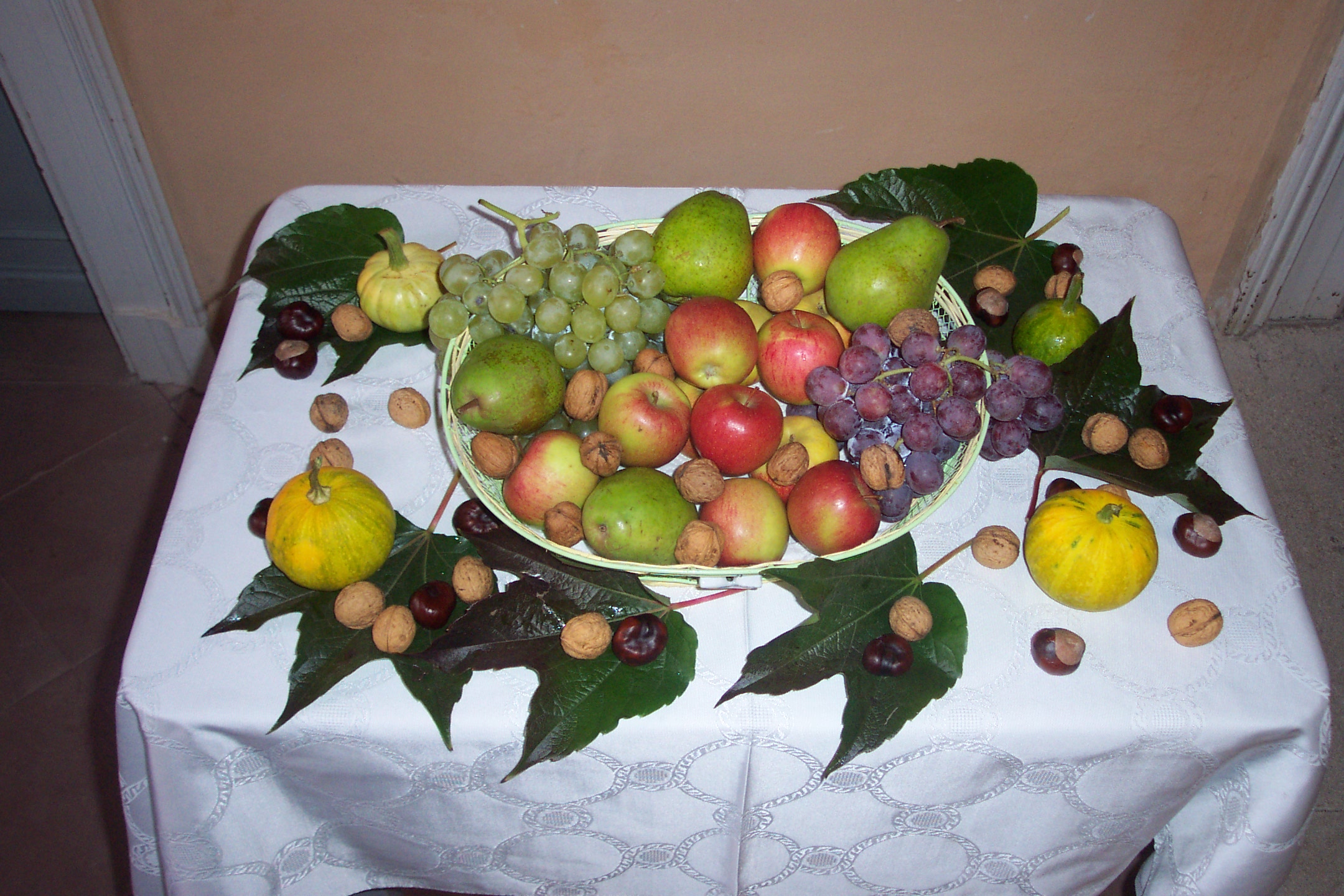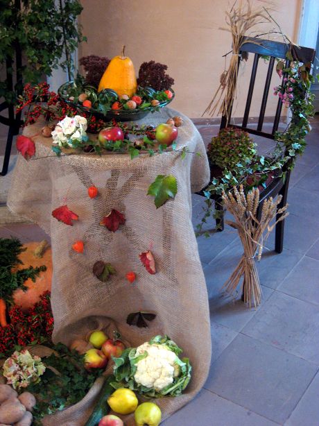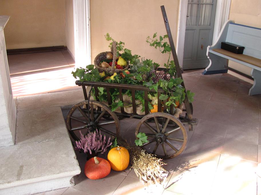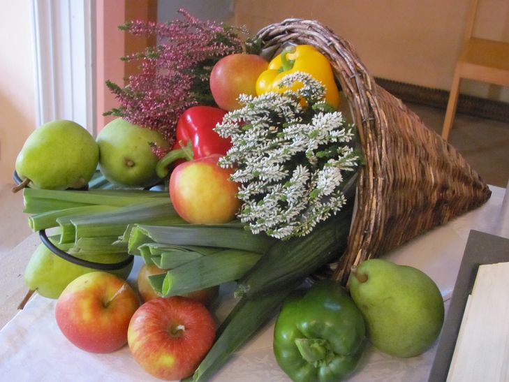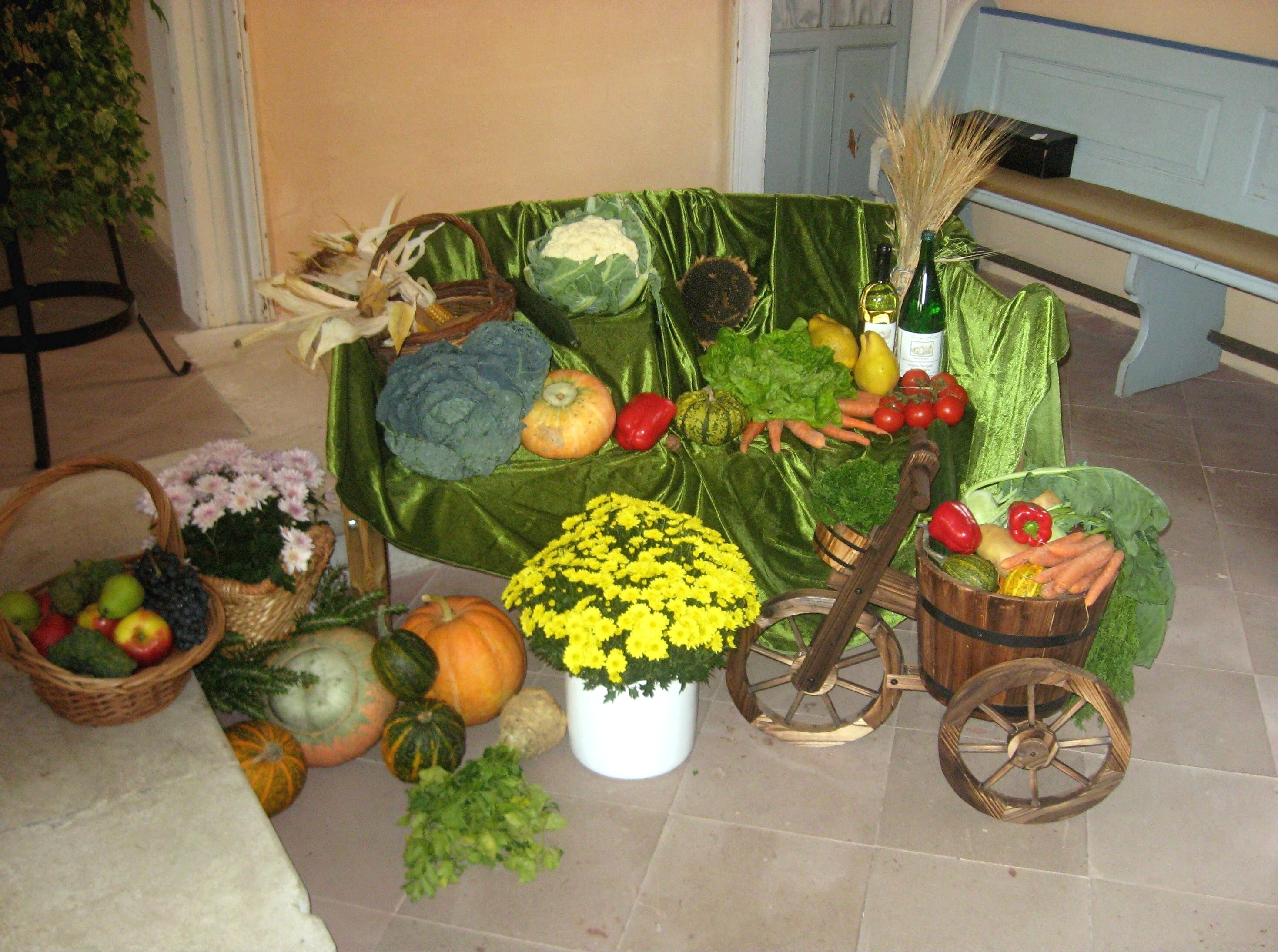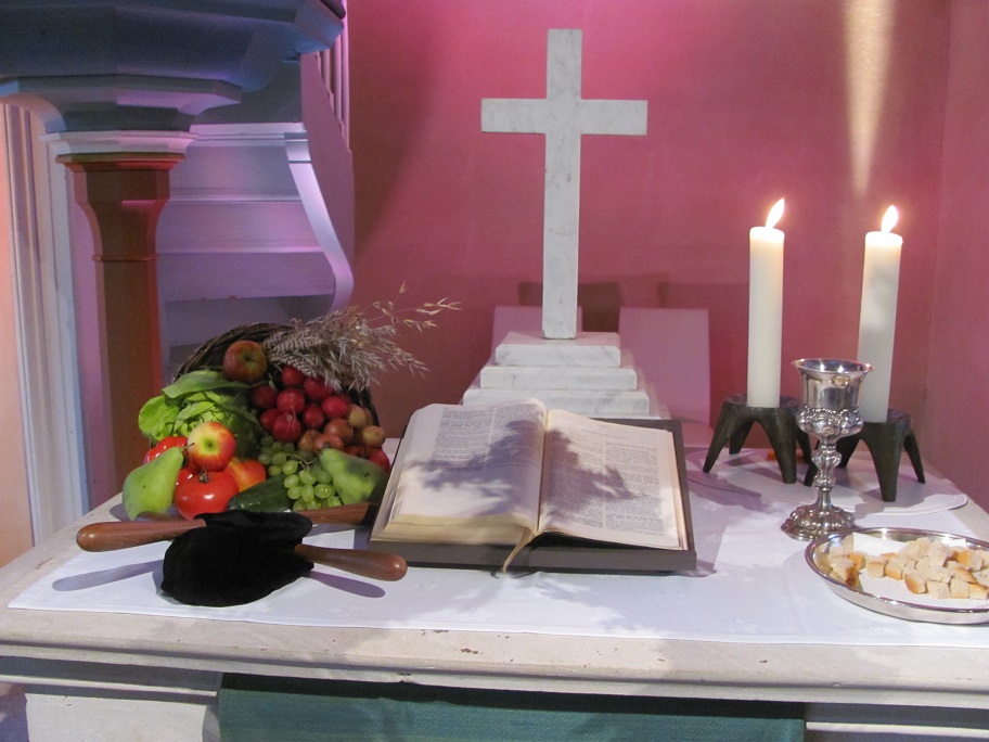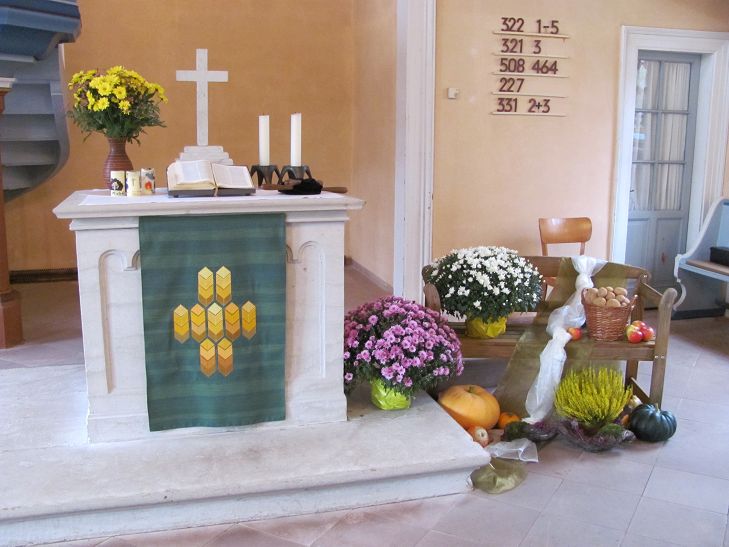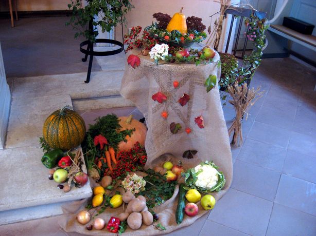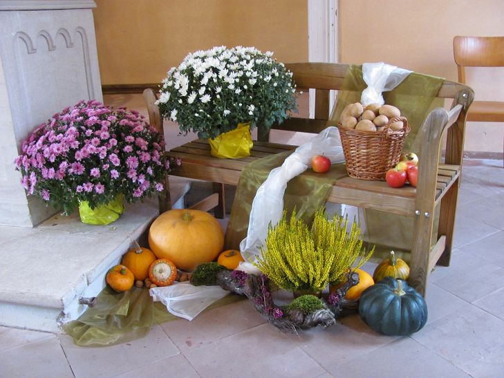 Zum Erntedankfest wird die evangelische Kirche von Gau-Weinheim mit Erntegaben, wie Blumen, Obst und Gemüse, geschmückt. Der Kirchenvorstand bemüht sich Jahr um Jahr neue Dekorationsmöglichkeiten zu finden.