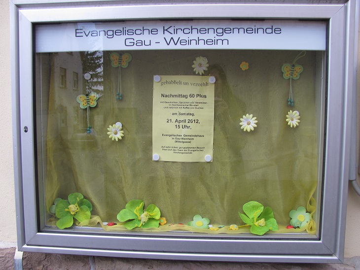 Der Nachmittag 60+ hat in der evangelischen Kirchengemeinde Gau-Weinheim eine lange Tradition. Seit vielen vielen Jahren lädt der Kirchenvorstand einmal im Jahr Bürger Gau-Weinheims (egal ob evangelisch oder katholisch) im Alter von mindestens 60 Jahren ein, um gemütlich selbstgebackenen Kuchen und Kaffee zu genießen.